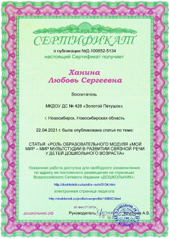 На основе полученных результатов моей деятельности был представлен опыт работы в сборнике статей Международного образовательного портала «Солнечный свет» статья «Развитие диалогической речи детей старшего дошкольного возраста через использование новых форм организации». Свидетельство о публикации № СВ 3170659-13.09.2021г.